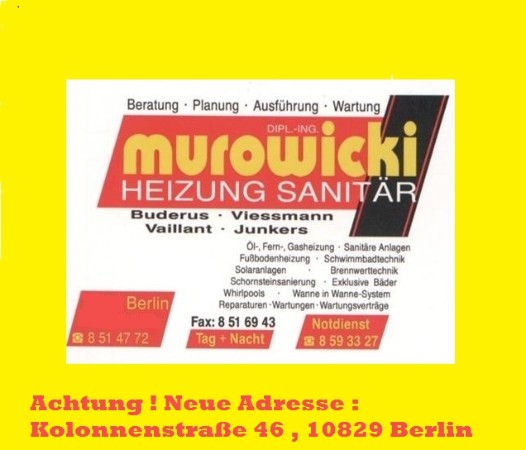 24 Stunden Notdienst für Berlin Tel 030/859 33 27 Berlin Notdienst Heizung Gas Heizung Öl Heizung ,Heizung Sanitär Notdienst in Berlin , Tag und Nacht Berlin Sofortdienst Gasgeräte Service, Berliner Reparatur- Service, Berliner Wartungdienst ,Gasgeräte Thermen, Installationen, Notdienst, Störungsdienst ,Sofortdienst, Wartung und Reparatur Heizung - Sanitär, Gasgeräte, Vaillant ,Junkers, Buderus, Viessmann, Heiztechnik, Solar, Beratung, Planung, Ausführung Altbausanierung, Reparaturen, Wartungen, Planet Magic Bad, Kesselnominator, Kessel und Thermen Austauschprofi , Hausverwaltung-Service, Stiebel Eltron ,Heiztechnik Vaillant-Kundendienst ,Junkers-Kundendienst, Buderus-Kundendienst, Viessmann-KundendienstHeiztechnik, Solar, Beratung, Planung, Altbausanierung, Reparaturen, Wartungen, Planet Magic Bad, Planung 3 D Vision Kompletausführung, Stiebel Eltron Gasgeräte, Gaskesel Dipl. -Dipl.-Ing.Murowicki Haustechnik, Notdienst, Sofortdienst, Störungsdienst, Rohrbruch ,Verstopfung, 24 Stunden Notdienst für Berlin, Steglitz Wielmersdorf Schöneberg Grunewald,Zehlendorf, Tempelhof, Kreuzberg, Charlotenburg, Westend,Wannsee,Lichterfelde, Friedenau,Heizung, Ölfeurung, Gasfeuerung, Gaskessel, Vaillant, Junkers, Buderus, Viessmann, Wolf, Saunier Duval, DWS, Rohrreinigung, Verstopfung, Rohrbruch, Installationen, Wasser, Gas, Heizung, Wasserschaden beseitigung, Austrocknung, Elektro-Warmwassergeräte,Steibel Eltron Siemens, Vaillant, Junkers, Sofordienst,Notdienst, http://www.planetmagicbad.de http://www.planetmagicbad.de/ http://www.murowicki.de Murowicki@t-online.de Dipl.-Ing. Marian Murowicki ,12161 Berlin, Fax Tel. 030/ 851 47 72 Fax 030/851 69 43 Beratung, Planung und Montage im Bereich Haustechnik, Heizung, Bad und Klimatisierung. Kessel und Thermeaustauschprofi, Heizungsanlagen für Einfamilienhäuser und Wohnanlagen. Dipl.-Ing. Murowicki Heizung Sanitär Haustechnikservice Gas Wasser Heizung Gasgeräteservice Gasgeräte Reparatur Wartung, Gasthermenwartung ,Thermenwartung,Vaillant Junkers Viessmann, Buderus, Wolf, De Dietrich, Unical, Brötje, Saunuer Duval, DWS, Dipl.-Ing. Murowicki Heizung Sanitär -Große Ideen zu kleinem Preis ein Anruft genügt Gasgeräteservice Berlin Versorgungstechnik Gas Wasser Heizung Berlin Gasgeräteservice für Vailllant Gasgeräte Berlin Gasgeräteservice für Junkers Gasgeräte Berlin Gasgeräteservice für Viessmann Berlin Gasgeräteservice für Buderus Gasgeräte Kundendienst, Sofortdienst, Notdienst, Gas, Wasser, Heizung, Klempner, Wasserrohrbruch, Rohrbruch, Rohrverstopfung, Abflussverstopfung,Rohrreinigung, Abflussreinigung |  |  |  | |